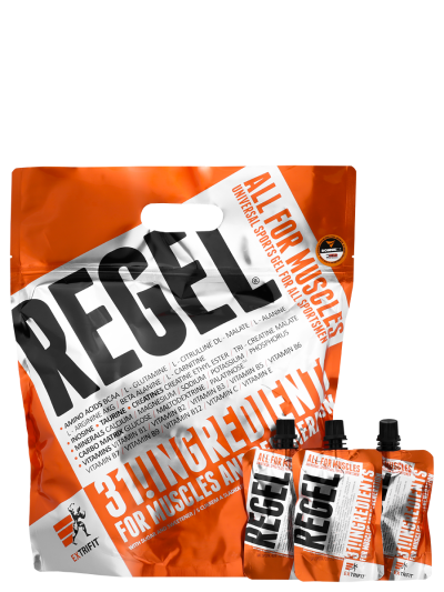 REGEL® je regenerační produkt na trhu pro použití při tréninku a zejména po tréninku. Je to unikátní regenerační a energetizující gel z kategorie all-in-one (vše v jednom), který Vám dodá všechny potřebné živiny pro rychlou regeneraci a obnovení energie po tvrdém tréninku. Obsahuje pečlivě vyvážený poměr tří druhů sacharidů a volných aminokyselin, anabolizéry, dvě formy kreatinu a komplex vitamínů a minerálních látek. A to vše ve formě hotového gelu připraveného k okamžité konzumaci! Sáček s uzávěrem jde navíc opětovně zavřít a rozdělit tak obsah do několika dávek a přizpůsobit potřebám vašeho tréninku. Pro koho je Regel určený? Regel je určený pro všechny sportovce, kteří potřebují zrychlit regeneraci po tréninku a odstranit únavu po fyzickém výkonu. Je tak určen pro kulturisty a příznivce všech fitness kategorií, pro hokejisty, zápasníky, motorkáře, cyklisty, běžce, lyžaře, horolezce, strongmany, ironmany a pro všechny další silové, silově vytrvalostní i vytrvalostní sportovce, kteří chtějí jedním produktem okamžitě doplnit po tréninku všechny potřebné látky. A to vše v rychle vstřebatelné a kompaktní formě. Díky uzávěru si navíc obsah sáčku můžete rozdělit do několika dávek a užívat v průběhu různých fází vašeho tréninku i bezprostředně po jeho skončení. Jaké suplementy užívat pro regeneraci po tréninku? Lámali jste si někdy hlavu nad tím, jaké všechny látky a v jakém množství máte dávkovat pro urychlení regenerace po tréninku? Jaké přijímat sacharidy, jak dávkovat aminokyseliny nebo kolik užívat glutaminu a kreatinu pro odvrácení katabolismu po tréninku? Firma Extrifit vyslyšela tyto Vaše časté dotazy! Regel je dokonale sestaveným komplexem všech látek, které sportovec nutně potřebuje doplnit v průběhu a po skončení tréninku! Regel obsahuje pečlivě vyvážený poměr tří druhů sacharidů a volných aminokyselin, anabolizéry, dvě formy kreatinu a komplex vitamínů a minerálních látek. A to vše ve formě hotového gelu připraveného k okamžité konzumaci. Jaké jsou výhody gelové formy oproti míchání koktejlů? Nosíte s sebou kvůli tréninku celý den šejkr, odsypaný gainer a protein i krabičku s tabletami aminokyselin a kreatinu? Není právě pro Vás vhodnější forma gelového all-in-one produktu v malém sáčku, který můžete mít celý den u sebe na večerní trénink, můžete jej vozit na kole, brát si jej s sebou na běhání, na motorky, na túry nebo na lyže, na zápasy, do tělocvičny, na ledovou plochu, zkrátka brát si jej na jakékoliv sportoviště? Nepotřebujete nosit žádné další nádoby jako lahve a šejkry, nemusíte hledat zdroj vody a míchat si koktejl na koleně v šatně, nic takového. Gely Extrifit prakticky fungují tak, že otevřete uzávěr, „vycucnete“ tolik gelu, kolik zrovna potřebujete (např. v různých fázích tréninku), uzavřete uzávěr a další dávku si dáte později (např. na konci tréninku). Nemusíte nic připravovat, nic míchat, nic odměřovat… Vše v Extrifitu udělali za Vás a gel je hotový a připravený k okamžité konzumaci. Gel můžete mít u sebe celý den, aniž by Vám překážel, můžete ho brát s sebou na cesty a na výlety i na dovolené a nikoho neobtěžujete přípravou suplementů, ani se nemusíte trápit s vláčením žádných dalších objemných nádob. Co vše Regel obsahuje? Regel obsahuje široký komplex látek nutných pro rychlou regeneraci po fyzické zátěži: tři vyvážené zdroje sacharidů (maltodextrin, dextrózu a isomaltulózu Palatinose), které zajistí Vašemu tělu dostatek energie a podpoří procesy zotavení po sportovním výkonu. Obsah volných aminokyselin zajistí regenerační a antikatabolický účinek (větvené aminokyseliny BCAA, alanin a nejvíce zastoupená aminokyselina ve svalové hmotě - glutamin). Energizéry jako inosin, taurin a karnitin odvrátí únavu po fyzické aktivitě. Dvě formy kreatinu – kreatin ethyl ester a tri kreatin malát – rychle obnoví a navýší zásoby kreatinfosfátu v zatížených svalech. Anabolizéry jako beta alanin, citrulin a arginin AKG, jež působí jako stimulanty produkce NO (oxidu dusnatého), Vám zvýší průtok krve do svalů a tím natlačí všechny potřebné látky pro regeneraci až do svalových buněk. Unikátní vitamínový matrix a komplex minerálních látek pak zabezpečí dostatek všech mikronutrientů nutných k regeneraci organismu po fyzické zátěži. Díky tomuto vícesložkovému produktu v praktické formě gelu dodáte vašemu organismu komplexní spektrum látek a není tak nutné po tréninku užívat další oddělené produkty. Nabízíme Vám jej v sedmi velmi chutných ovocných příchutích, které obsahují pouze přírodní barviva. Obsah minerálních látek v produktu Regel: