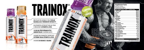 ! Obsahuje kofein, není vhodné pro děti a těhotné ženy. Denní dávka (1 shot) obsahuje 310 mg kofeinu. Produkt není vhodný pro osoby trpící přecitlivělostí na kofein. TRAINOX® je doplněk stravy určený pro totální maximalizaci tréninkové intenzity. Jedná se o multikomponentní produkt obsahující zcela novou a brutálně silnou směs účinných látek určených pro předtréninkové použití. Znáte AGREZZ®? Evropský hit a bestseller mezi pre-workouty? Máte ho v oblibě? Tak TRAINOX® si zamilujete také. Ještě silnější složení a díky jednorázovým shotům připraveno rovnou ke konzumaci! Tekutá forma produktu navíc zajišťuje rychlou a výbornou vstřebatelnost.