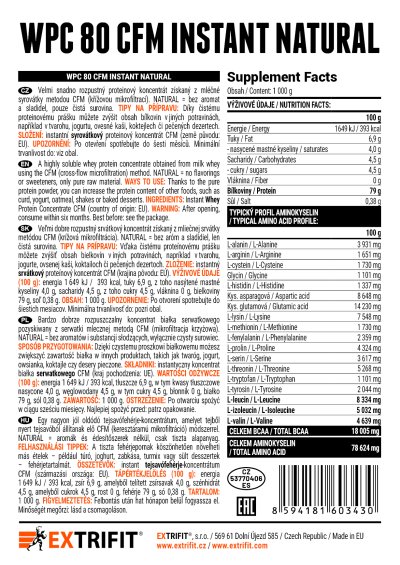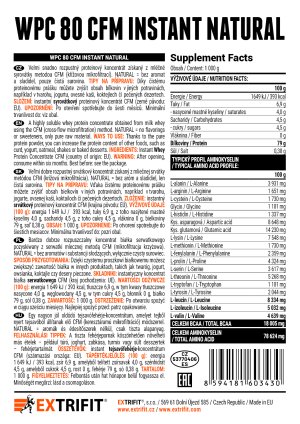 NATURAL = bez aromat a sladidel, pouze čistá surovina. WPC 80 CFM INSTANT NATURAL je instantní (velmi snadno rozpustný) proteinový koncentrát získaný ze syrovátky mikrofiltrací metodou CFM (Cross-Flow Microfiltration). Příjem tohoto vysoce kvalitního zdroje proteinu přispívá k růstu svalové hmoty a k jejímu udržení v situacích, kdy je ohrožena katabolizací. Doporučené dávkování: