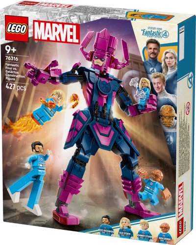Fanoušci filmu Fantastická čtyřka: První kroky od studia Marvel si zinscenují akční momenty z filmu se stavebnicí LEGO® | Marvel (76316) Fantastická čtyřka vs. sestavitelná figurka Galactuse, vůbec první stavebnicí LEGO s Fantastickou čtyřkou! Tato hravá stavebnice LEGO | Marvel poslouží jako působivý dárek pro kluky a holky od 9 let, kteří milují superhrdinská dobrodružství. Tato stavebnice LEGO | Marvel Fantastická čtyřka obsahuje 4 minifigurky: Součástí je Mr. Fantastic s výsuvnýma nohama, Human Torch se 2 ručními blastery, dílky v podobě plamenů připevněných k nohám a průhlednou podpěrou, která mu umožňuje „létat“, Invisible Woman se 2 silovými štíty a Thing s velkýma a mocnýma rukama. Plně pohyblivá figurka ikonického filmového padoucha Galactuse měří přes 28 cm na výšku. Tato pohyblivá figurka nastartuje nekonečné akční souboje se superhrdiny. Pro ještě větší digitální zábavu si stavitelé můžou přibližovat a otáčet modely ve 3D a sledovat svůj pokrok pomocí zábavné a intuitivní aplikace LEGO Builder. Model obsahuje 427 dílků.