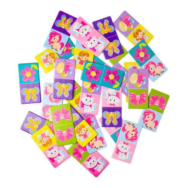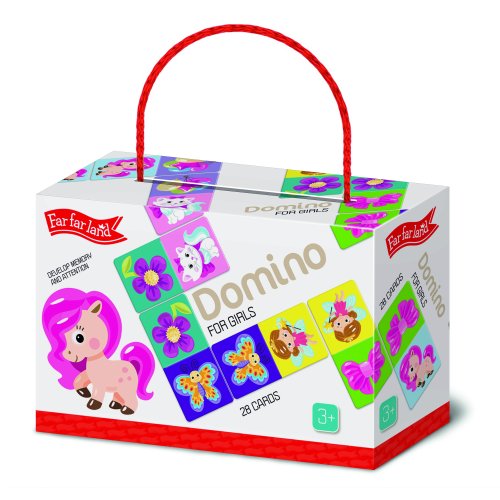 Far Far Land Domino s obrázky pro dívky. Balení obsahuje 28 karet. Hra pro 2-5 hráčů. Při hře 2 hráčů každý hráč dostane 7 karet. Při hře více hráčů každý dostane 5 karet. Zbývající karty jsou v "banku.“ Hráč, který má "dvojitou" kartu (kartu s totožnými obrázky), hraje první. Pokud žádný z hráčů nemá dvojitou kartu, každý hráč si vezme jednu kartu z banku. Pokud má více hráčů dvojitou kartu, začíná ten mladší. Pro rozehrání prvního tahu si však můžete vymyslet svá vlastní pravidla. Hráči se střídají a jeden za druhým přikládají karty ze své ruky ke kartám na hrací ploše se shodným obrázkem. Pokud hráč nemá shodný obrázek, musí si vzít kartu z banku. Hráč, který položí svou poslední kartu na hrací plochu, vyhrává. Pokud všichni hráči mají v ruce karty, ale není možné hrát dál, hra je ukončena "blokem" a vyhrává hráč, který má v ruce nejmenší množství karet.