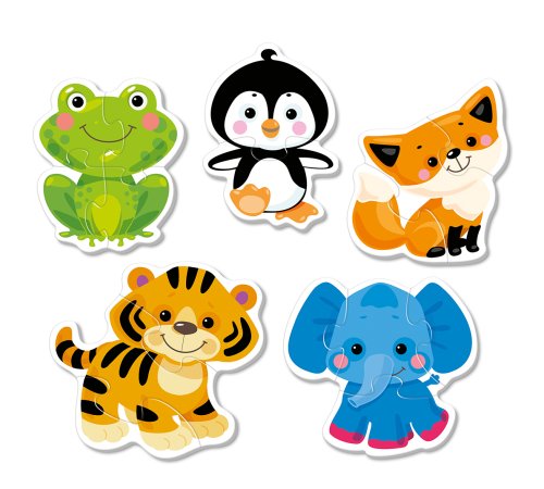 Puzzle obrysové pro děti, motiv zvířátka. Balení obsahuje 5 puzzle obrázků, které se skládají ze 2 až 4 dílků.