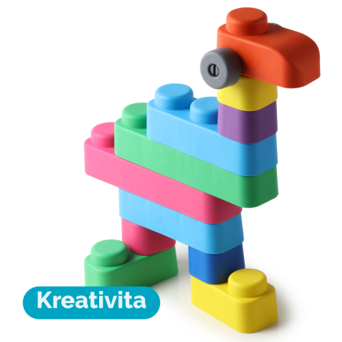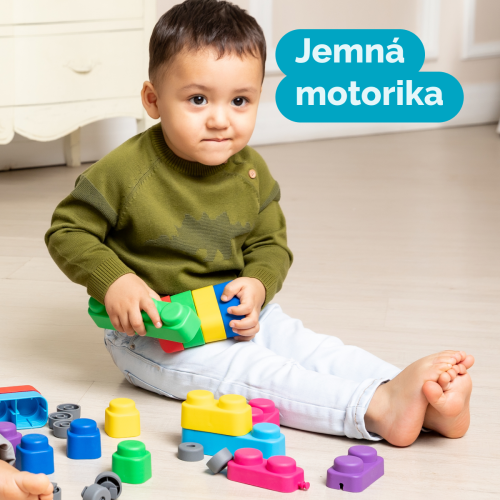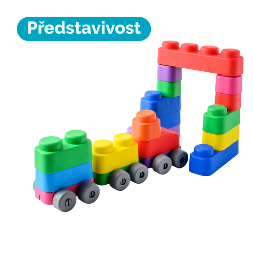 Far Far Land Stavebnice měkká. Všechny bloky jsou vyrobeny z měkkého bezpečného materiálu. Balení obsahuje 25 barevných bloků a 16 koleček.