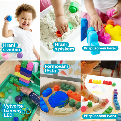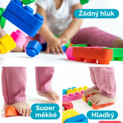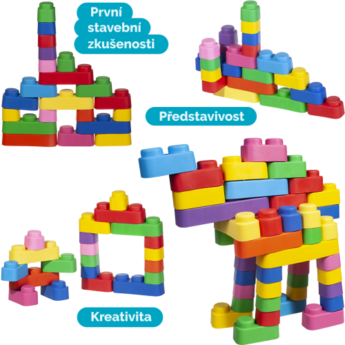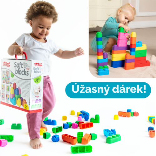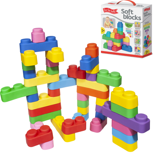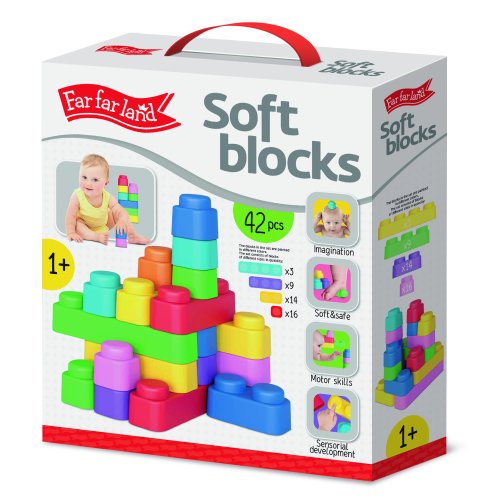Far Far Land Stavebnice měkká. Balení obsahuje 42 barevných měkkých bloků (3xčtyřblok, 9xtrojblok, 14xdvojblok. 16xjednoblok). Všechny bloky jsou vyrobeny z měkkého bezpečného materiálu.