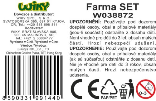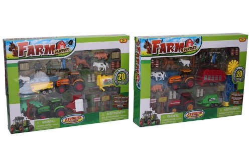Farma set. Velikost traktorů 7,5 cm, figurek farmářů 4 cm. Součástí 2 traktory, 3 figurky farmářů, figurka koně, prasete, krávy, ovečky, rozcestník, cedule, sudy a další. 2 varianty - větrník, strom.