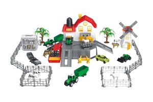 Farma se zvířátky. Součástí vše z obrázků na obalu - farma, mlýn, traktor s vlečkou, sklápěč, nakladač, přepravní vozidlo, ohrada, stromy, figurky zvířátek (koně, slepice, ovce, kozy, pes). Obrázkový návod na složení na zadní straně obalu.