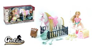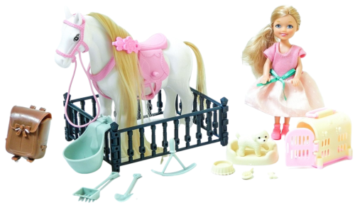 Součástí sady je koník, panenka, ohrada, pejsek, pelíšek a další doplňky. Výrobek je vhodný pro děti od 3 let.