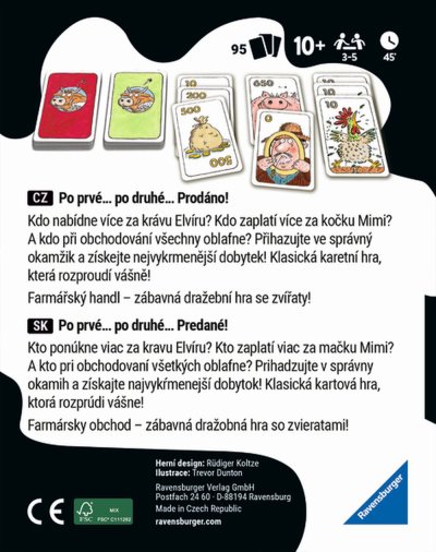 Po prvé ... po druhé ... Prodáno! Kdo nabídne více za krávu Elvíru? A kdo při obchodování všechny oblafne? Přihazujte ve správný okamžik a získejte nejvykrmenější dobytek! Farmářský handl - zábavná dražební hra se zvířaty! Každý hráč se snaží v dražbě získat co nejvíce zvířecích kvartet s co nejvyšší hodnotou. Vítězem se stává ten, kdo získá nejvíce bodů. Peníze nemají na konci žádnou cenu. Obsahuje: 40 karet zvířat, 55 karet peněz, pravidla hry