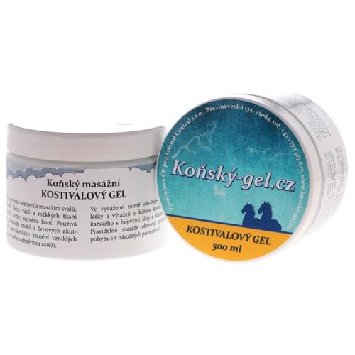 Gel k zevnímu ošetření a masážím svalů, kloubů, šlach, vazů a měkkých tkání velkých zvířat, zejména koní. Používá se na masáže otoků a čerstvých akutních nekrvácejících zranění vzniklých úrazem nebo nadměrnou zátěží. Ve vyvážené formě obsahuje chladivé látky a výtažek z kořene kostivalu lékařského s hojivými slizy a alantoinem. Pravidelné masáže obnovují pružnost pohybu i v náročných podmínkách. Složení: Aqua, Alcohol Denat., Glycerin, Carbomer, Symphytum Officinale Root Extract, Phenoxyethanol, Ethylhexylglycerin, Camphor, Menthol, Allantoin, Caramel, Sodium Hydroxide. Návod k použití: Po zátěži, nebo při výskytu těžkostí 1-2x denně vmasírovat do postiženého místa. Gel lze smývat vodou. Je použitelný i pro psy. Po aplikaci nebandážovat! Upozornění: Skladujte při teplotě 15 - 25 °C. Uchovávejte mimo dosah dětí! Pouze pro zvířata! Mikrobiologicky testováno a bezpečné.
