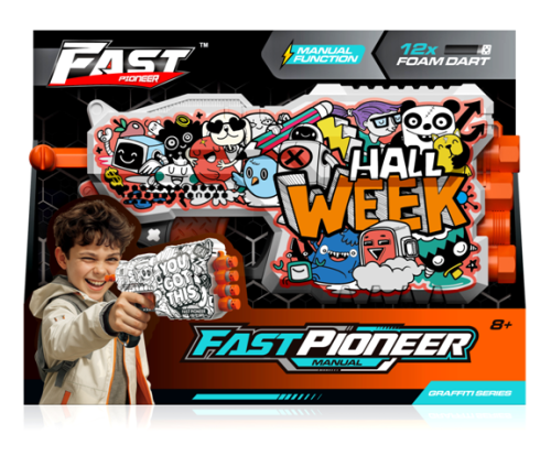 Fast Pioneer Blaster manuální je dětská pistole navržená pro zábavnou a bezpečnou hru bez potřeby baterií. Tato ručně natahovací zbraň umožňuje jednoduché ovládání díky manuálnímu mechanismu, který dítě snadno zvládne. Pistole je vyrobena z lehkého a odolného plastu, což zajišťuje pohodlné držení a dlouhou životnost i při aktivním používání. Celkový design je výrazně barevný a moderní, inspirovaný streetartem a graffiti, což ji dělá atraktivní zejména pro mladší hráče.