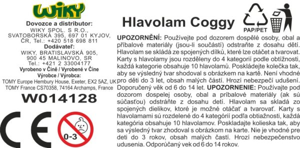Hlavolam Coggy. Hlavolam se skládá z 16 spojených dílků, které lze otáčet a tvarovat. Ideální na cesty. Součástí balení je 40 hlavolamů. Karty s hlavolamy jsou rozděleny do 4 kategorií podle obtížnosti, každá kategorie obsahuje 10 hlavolamů. Poskládejte kolečka tak, aby se výsledný tvar shodoval s obrázkem na kartě. Prázdná místa na kartě mohou být libovolné barvy. Kolečka jsou oboustranná (barevná a černobílá), každá strana slouží k řešení jiného druhu hlavolamu.