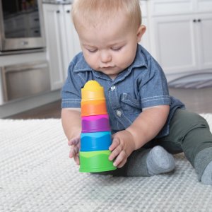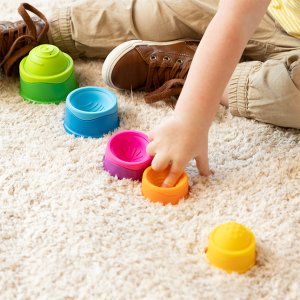 Fat Brain Stohovací kloboučky Dimpl Stack. Balení obsahuje 5 kloboučků. Z měkkého materiálu. Každý klobouček má unikátní barvu a texturu na ohmat.