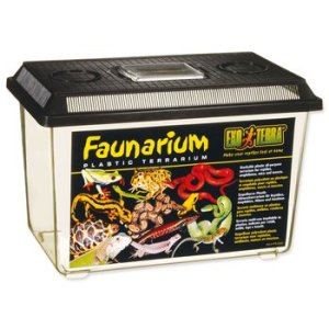 Přenosný průhledný plastový box pro terarijní zvířata.
