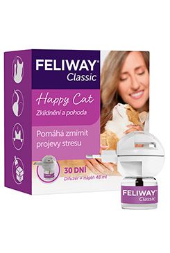 Difuzér FELIWAY® Classic pomáhá utišit neklidné kočky (v domácnosti nebo na cestách) a zabránit nežádoucímu chování, jako je značkování močí, škrábání nebo ukrývání. Dociluje toho tím, že do okolí nepřetržitě rozptyluje kopii zklidňujícího obličejového feromonu, jimž kočky označují své prostředí jako bezpečné a domácí. Jeden difuzér pokryje prostor o rozloze až 70 m2. Složení: syntetická forma kočičího tvářového feromonu frakce F3 (2 %), excipient q. s. (100 g). Doba účinnosti: 1 náplň (VET01085)/až 30 dní Použití: Odstraňte uzávěr nádobky, našroubujte difuzér na nádobku a jemně utáhněte. Zasuňte difuzér do elektrické zásuvky tak, aby knot směřoval vzhůru, a nechejte jej stále zapojený. Nezapojujte difuzér do zásuvek pod poličkami, za dveřmi, závěsy a nábytkem – omezený přístup vzduchu snižuje jeho účinnost. Pro optimální účinek difuzér každý měsíc zkontrolujte a jednou za šest měsíců nahraďte novým. Upozornění: Difuzér je určen k použití v interiéru. Přípravek nemá sedativní účinky, a je-li používán v souladu s doporučeními, feromony v něm obsažené jsou bezpečné pro zvířata i lidi. Určeno pro použití pouze v rozmezí napětí 220–230 V. Nikdy nepoužívejte s adaptérem nebo konvertorem napětí. Náplň FELIWAY® Classic (VET01085) může být použita jen s difuzérem FELIWAY® Classic.