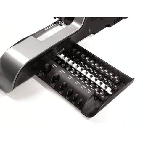 Stroj je vybaven větším zásobníkem na uložení několika plastových hřbetů a integrovanou měrkou pro správnou volbu průměru hřbetu. Na čelní straně stroje je průzor pro snadnou kontrolu zaplnění odpadního prostoru.