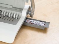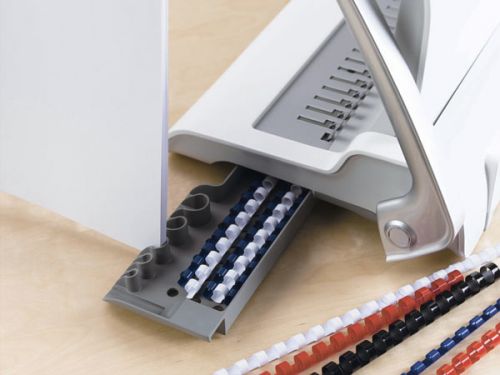 Stroj je vybaven zásobníkem na uložení několika plastových hřbetů a integrovanou měrkou pro správnou volbu průměru hřbetu. Na čelní straně stroje je průzor pro snadnou kontrolu zaplnění odpadního prostoru.