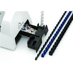 Oddělená děrovací a vázací páka pro průběžné vkládaní děrovaných listů do plastového hřbetu výrazně zefektivňuje práci. Díky delší děrovací páce je třeba k děrování minimum síly. Stroj je vybaven integrovanou měrkou pro správnou volbu průměru hřbetu.