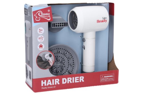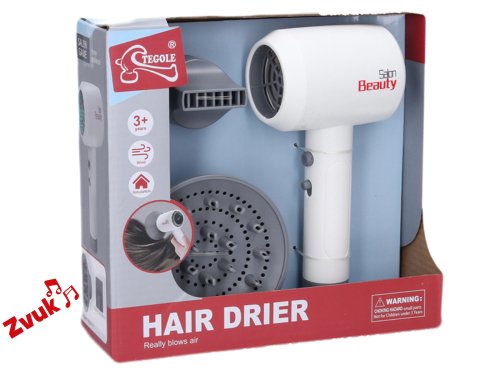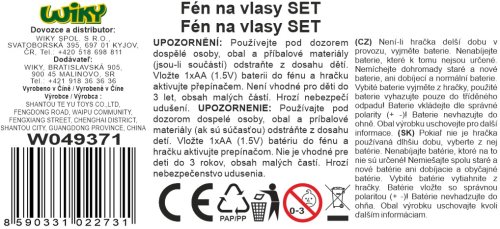 Fén na vlasy. Funkce foukání, dva nástavce, on/off tlačítko a tlačítko bez funkce. 1xAA baterie není součástí. Velikost 18cm.