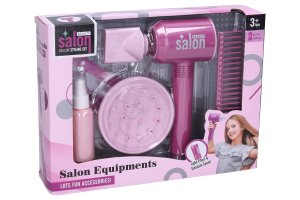 Fén s příslušenstvím. Velikost fénu 19cm. Obsahuji fén s nástavci, hřeben lahvičku na přípravek na vlasy. Skutečně fouká vzduch. Přepínač má tři polohy: 2rychlosti a vypnutí. 3xAAA baterie nejsou součástí.