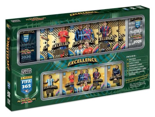 Sběratelské karty PANINI FIFA 365 2025/2026 - EXCELLENCE BOX. Box obsahuje: 5 karet EXCELLENCE CARDS, 5 karet XXL EXCELLENCE CARDS, 24 karet AURA CARDS, 24 karet NUMBERS CARDS, 4 balíčky karet (v každém balíčku je 6 karet). A navíc 1 kartu EXCELLENCE LIMITED EDITION COLE PALMER.