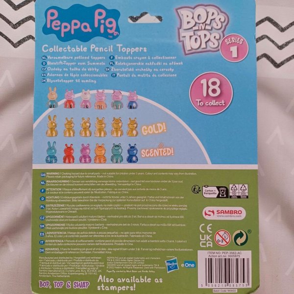 Tyto malé roztomilé figurky z oblíbeného filmu Prasátko Peppa čekají, kdy si s nimi ozdobíš své tužky. Každou postavičku můžeš nasunout na pastelku. Vybarvování, psaní i kreslení nebylo nikdy zábavnější. Postavičku si můžeš sundat a zahrát si s ní různé příběhy. V balení najdeš 5 postaviček (jednu zlatou a jednu voňavou). Celkem jich můžeš posbírat až 18 (6 normálních, 6 zlatých a 6 voňavých).