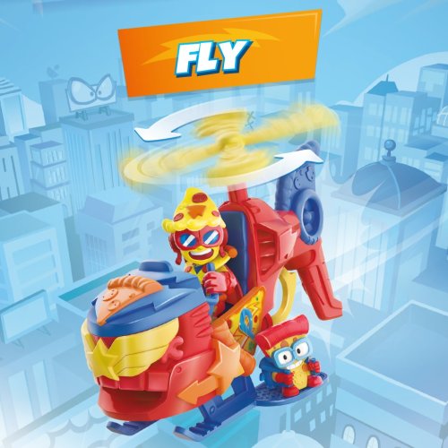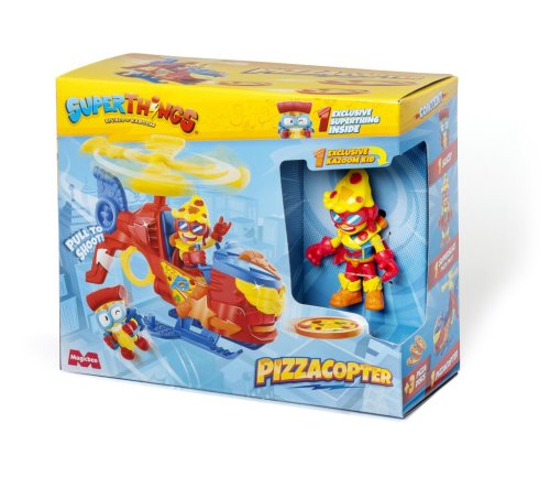 SUPER ZINGS je řada sběratelských figurek, které milují děti po celém světě. Hlavními postavami jsou předměty každodenní potřeby, které byly oživeny tím, že jim daly lidské vlastnosti. Každá postava má svou vlastní osobnost, mimořádný charakter a mimořádné talent.Charakteristickým znakem figurek Super Zings je, že jim byl přiřazen titul Superhrdinové nebo Superpadouši. Superschopnosti jim umožňují prožívat nezapomenutelná dobrodružství a o tom, zda je postava dobrá nebo špatná, svědčí jejich barva očí – stvoření s bílými očima budou pozitivní a žlutými negativními.Figurka SuperThings S Vrtulník Pizzacopter s vystřelovačem disků – nová hlídka pozoruje město ze vzduchu: je to SuperSlice z Pizzacopter! Pokud někdo potřebuje, abyste ho chránili před padouchy, můžete ho sestřelit pomocí spouště.