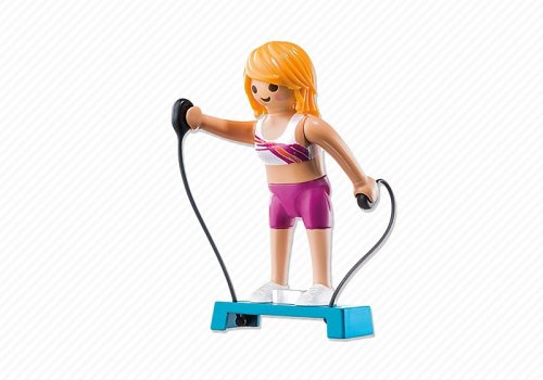 Figurka Trenérka fitness s příslušenstvím z řady Playmobil. Trénink se zaměřuje na step aerobic.