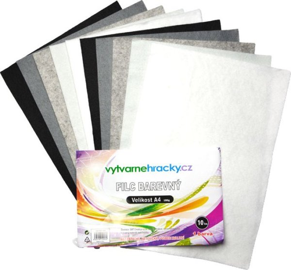 Filc nebo-li plsť je netkaná textilie, kterou můžete použít ke stříhání, lepení, šití, vyšívání. Můžete z něj s dětmi vyrábět přáníčka, záložky, polštářky, figurky, loutky, ozdoby či šperky, polepovat krabičky a dále jej zdobit různými kamínky či motivy. Tvořte co vás napadne! Filc A4 - černobílý mix 10 ks: 2x černý, 2x šedivý, 2x melír, 4x bílý