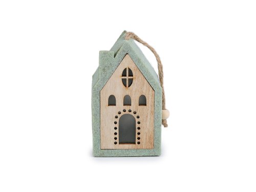 Svítící domeček je vyrobený z kombinace dřeva a pevného filcu. Svítí příjemným teplým světlem, které vypadá jako hvězdička. Díky poutku ho můžete pověsit na větvičky ve váze, na věnce i na vánoční stromeček. Baterie (CR2032) je součástí balení.