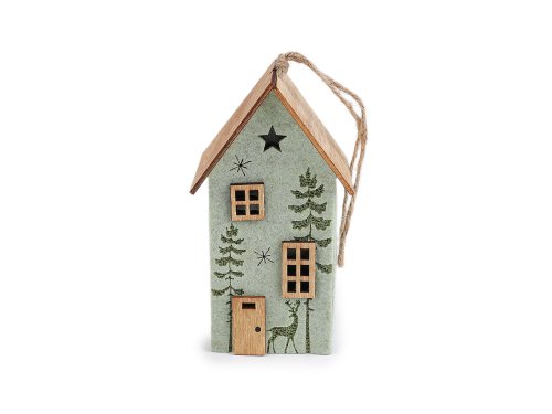 Svítící dekorační domeček má základ z pevného filcu a střechu a detaily ze dřeva. Přední stranu zdobí motiv lesa s jelenem a výřezy hvězd. Svítí příjemným teplým světlem, které zútulní každý interiér. Díky poutku ho můžete pověsit na větvičky ve váze, na věnce i na vánoční stromeček. Baterie (CR2032) je součástí balení.