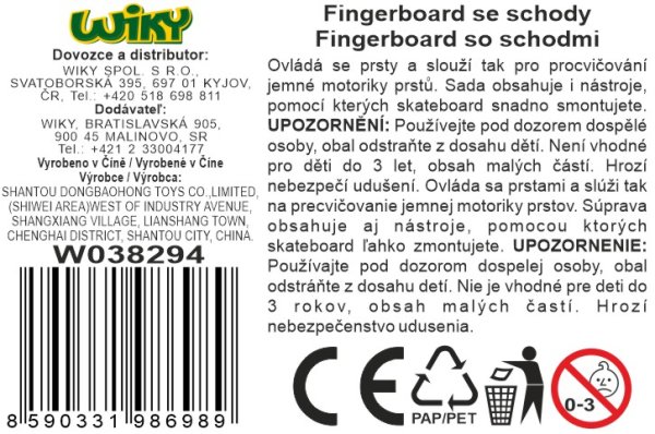 Fingerboard sada se schody. Rozměry schodů 23,5x10x9,5 cm, velikost fingerboardu 9,5 cm. Obsahuje: schodiště se zábradlím, 1x kompletní fingerboard, 4 náhradních koleček, 2 náhradní šroubky, 2 náhradní matice, šroubovák, klíč.
