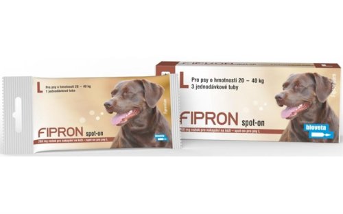 • dodržujte stanovené dávkování a dávkovací režim. Přípravek podávejte v dávkách doporučených výrobcem, aby byl zajištěn optimální terapeutický účinek. 4.5 Zvláštní opatření pro použití Zvláštní opatření pro použití u zvířat Je důležité aplikovat přípravek na takové místo, ze kterého si jej zvíře nemůže slíznout, a po aplikaci zabránit vzájemnému olizování zvířat. Přípravek aplikovat pouze na povrch kůže. Nepodávat perorálně nebo parenterálně. Vyhnout se podání přípravku na sliznice (do očí, nozder, na sliznice genitálií a na poraněnou kůži). V případě výskytu blech je vhodné současné ošetření ostatních zvířat v domácnosti insekticidními přípravky. Koupání/šamponování zvířete se nedoporučuje během 2 dnů po aplikaci, stejně jako koupání častější než jedenkrát týdně. Po aplikaci přípravku zabraňte koupání psa v přírodních vodních zdrojích (viz bod 6.6). Některá klíšťata se mohou po ošetření přichytit, ale jsou usmrcena 24 - 48 hodin po aplikaci. K tomu obvykle dochází před maximálním napitím klíštěte, což minimalizuje, ale nevylučuje riziko přenosu transmisivních onemocnění. Blechy z domácích zvířat často zamořují zvířecí přepravky, místa, kde zvíře spí a odpočívá, jako jsou koberce a domácí vybavení, které je třeba v případě masivního napadení a na začátku ochranných opatření pravidelně ošetřovat vhodnými insekticidy a čistit pomocí vysavače. Zvláštní opatření určené osobám, které podávají veterinární léčivý přípravek zvířatům Lidé se známou přecitlivělostí na fipronil nebo na některou z pomocných látek by se měli vyhnout kontaktu s přípravkem. Zabraňte kontaktu přípravku s prsty. V případě potřísnění si umyjte ruce mýdlem a vodou. Tento přípravek může způsobit podráždění sliznic a očí. Proto zabraňte kontaktu přípravku s ústy a očima. V případě náhodného zasažení očí je důkladně vypláchněte vodou. Pokud podráždění přetrvává, vyhledejte lékařskou pomoc a ukažte příbalovou informaci nebo etiketu praktickému lékaři. Nemanipulujte s ošetřenými zvířaty a zamezte dětem hrát si s nimi, dokud místo aplikace nezaschne. Doporučuje se proto neošetřovat zvířata během dne, ale v podvečer, a nedovolit čerstvě ošetřeným zvířatům spát s jejich majiteli, zejména s dětmi. Během aplikace přípravku nekuřte, nepijte ani nejezte. Po použití si umyjte ruce. Další opatření: Fipronil může mít nežádoucí účinky na vodní organismy. Psům by nemělo být dovoleno plavat ve vodních tocích po dobu 2 dnů po ošetření. Přípravek může mít nepříznivý vliv na natřené, lakované nebo jiné plochy v domácnosti nebo vybavení bytu. 4.6 Nežádoucí účinky (frekvence a závažnost) Po olíznutí přípravku se může objevit krátkodobá hypersalivace způsobená charakterem vehikula. Velmi vzácně byly po použití hlášeny přechodné kožní reakce v místě aplikace (vyblednutí a vypadávání srsti, svědění, zarudnutí kůže) a celkové svědění nebo vypadávání srsti. Výjimečně byla hlášena hypersalivace, reverzibilní neurologické symptomy (hyperesthesie, deprese, nervozita), zvracení nebo dýchací problémy. V místě aplikace se mohou objevit kosmetické vady (slepená srst, bílé depozity). Vyvarujte se předávkování. V případě přetrvávajících nežádoucích účinků vyhledejte pomoc veterinárního lékaře. 4.7 Použití v průběhu březosti a laktace Bezpečnost byla ověřena u chovných a březích fen a u fen v laktaci, kterým byla několikrát podána trojnásobná dávka dávky doporučené. Přípravek může být podán chovným, březím i laktujícím fenám. 4.8 Interakce s dalšími léčivými přípravky a další formy interakce Nejsou známy. 4.9 Podávané množství a způsob podání Pro nedostatek údajů je minimální doba mezi dvěma aplikacemi 4 týdny. Způsob podání: podání nakapáním na kůži – spot-on. Dávkování závisí na hmotnosti zvířete. Psi o hmotnosti nad 20 kg a do 40 kg: obsah jedné tuby o objemu 2,68 ml (L) Takto zajistíte minimální doporučenou dávku fipronilu 6,7 mg/kg ž. hm. Měsíční léčba se doporučuje v případě vysokého rizika opakovaného napadení blechami, pokud je pes alergický na bleší kousnutí, v případě nutnosti kontroly napadení klíšťaty nebo při častém koupání psa za použití hypoalergenních nebo zvláčňujících šamponů. V oblastech, kde nehrozí vážné napadení blechami a klíšťaty, může být FIPRON spot-on pro psy aplikován každé dva až tři měsíce. Způsob podání: Tubu držte hrdlem nahoru a několikrát poklepejte na hrdlo prstem. Opatrně odlomte špičku kroutivým pohybem. Rozhrňte srst zvířete v kohoutku před lopatkami tak, aby byla viditelná kůže. Hrot nástavce přiložte na kůži a několikrát stiskněte tubu tak, aby se celý obsah tuby vyprázdnil přímo na kůži. FIPRON spot-on pro psy je účinný proti napadení blechami po dobu přibližně 2 měsíců a proti napadení klíšťaty po dobu až do 1 měsíce, v závislosti na síle zamoření prostředí. Blechy jsou usmrceny během 24 hodin po infestaci. 4.10 Předávkování (symptomy, první pomoc, antidota, pokud je to nutné) Laboratorní studie potvrdily bezpečnost pro cílový druh zvířat. Laboratorní studie byly prováděny na štěňatech (ve stáří 8 týdnů) a na psech o hmotnosti cca 2 kg. Podaná dávka byla pětkrát vyšší než doporučená dávka. Studie neprokázaly žádné nežádoucí účinky. Riziko výskytu nežádoucích účinků (viz bod 4.6) se může v případě předávkování zvýšit, proto by zvířata měla být vždy ošetřena pipetou správné velikosti, zvolenou podle hmotnosti zvířete. 4.11 Ochranné lh
