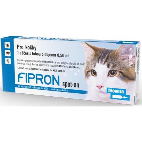 • dodržujte stanovené dávkování a dávkovací režim. Přípravek podávejte v dávkách doporučených výrobcem, aby byl zajištěn optimální terapeutický účinek. 4.5 Zvláštní opatření pro použití Zvláštní opatření pro použití u zvířat Je důležité zajistit aplikaci přípravku na takové místo, ze kterého si jej zvíře nemůže slíznout, a zabránit vzájemnému olizování zvířat. Přípravek aplikovat pouze na povrch kůže. Nepodávat perorálně nebo parenterálně. Vyhnout se podání přípravku na sliznice (do očí, nozder, na sliznice genitálií a do míst poranění kůže). V případě výskytu blech je vhodné současné ošetření ostatních zvířat v domácnosti ektoparaziticidy. Koupání/šamponování zvířete se nedoporučuje během 2 dnů po aplikaci, stejně jako koupání častější než jedenkrát týdně. Některá klíšťata se mohou po ošetření přichytit, ale jsou usmrcena 24 - 48 hodin po aplikaci. K tomu obvykle dochází před maximálním napitím klíštěte, což minimalizuje, ale nevylučuje riziko přenosu transmisivních onemocnění. Blechy z domácích zvířat často zamořují zvířecí přepravky, místa, kde zvíře spí a odpočívá, jako jsou koberce a domácí vybavení, které je třeba v případě masivního napadení a na začátku ochranných opatření pravidelně ošetřovat vhodnými insekticidy a čistit pomocí vysavače. Zvláštní opatření určené osobám, které podávají veterinární léčivý přípravek zvířatům Lidé se známou přecitlivělostí na fipronil nebo na některou z pomocných látek by se měli vyhnout kontaktu s přípravkem. Zabraňte kontaktu přípravku s prsty. V případě potřísnění si umyjte ruce mýdlem a vodou. Tento přípravek může způsobit podráždění sliznic a očí. Proto zabraňte kontaktu přípravku s ústy a očima. V případě náhodného zasažení očí je důkladně vypláchněte vodou. Pokud podráždění přetrvává, vyhledejte lékařskou pomoc a ukažte příbalovou informaci nebo etiketu praktickému lékaři. Nemanipulujte s ošetřenými zvířaty a zamezte dětem hrát si s nimi, dokud místo aplikace nezaschne. Doporučuje se proto neošetřovat zvířata během dne, ale v podvečer, a nedovolit čerstvě ošetřeným zvířatům spát s jejich majiteli, zejména s dětmi. Během aplikace přípravku nekuřte, nepijte ani nejezte. Po použití si umyjte ruce. Další opatření: Fipronil může mít nežádoucí účinky na vodní organismy. Kočkám by nemělo být dovoleno plavat ve vodních tocích po dobu 2 dnů po ošetření. Přípravek může mít nepříznivý vliv na natřené, lakované nebo jiné plochy v domácnosti nebo vybavení bytu. 4.6 Nežádoucí účinky (frekvence a závažnost) Pokud dojde k olíznutí, může se objevit krátkodobá hypersalivace způsobená charakterem vehikula. V rámci velmi vzácných nežádoucích účinků byly po ošetření zaznamenány přechodné kožní reakce v místě aplikace (alopecie, pruritus, erytém, tvorba šupinek) a celkové svědění nebo vypadávání srsti. Výjimečně byly zaznamenány hypersalivace, reverzibilní neurologické symptomy (hyperesthesie, deprese, nervozita), zvracení nebo dýchací problémy. V místě aplikace se mohou objevit kosmetické vady (slepená srst, bílé depozity). Vyvarujte se předávkování. V případě přetrvávajících nežádoucích účinků vyhledejte pomoc veterinárního lékaře. 4.7 Použití v průběhu březosti a laktace Bezpečnost byla ověřena u chovných a březích koček a u koček v laktaci, kterým byla několikrát podána trojnásobná dávka dávky doporučené. Přípravek může být podán chovným, březím i laktujícím kočkám. 4.8 Interakce s dalšími léčivými přípravky a další formy interakce Nejsou známy. 4.9 Dávkování a způsob podání Pro nedostatek údajů je minimální doba mezi dvěma aplikacemi 4 týdny. Způsob podání: podání nakapáním na kůži – spot-on. Dávkování: Aplikujte 1 tubu o obsahu 0,5 ml na kůži mezi lopatky. Způsob podání: Tubu držte hrdlem nahoru a několikrát poklepejte na hrdlo prstem. Opatrně odlomte špičku kroutivým pohybem. Rozhrňte srst zvířete mezi lopatkami tak, aby byla viditelná kůže. Hrot pipety přiložte na kůži a několikrát stiskněte tubu tak, aby se celý obsah tuby vyprázdnil přímo na kůži. Jedna dávka zajistí ochranu proti napadení blechami po dobu až 5 týdnů. Přípravek chrání proti klíšťatům po dobu 3 až 4 týdny. V případě alergické dermatitidy způsobené blechami Ctenocephalides felis se doporučuje opakovat aplikaci přípravku v intervalech 4 týdnů. 4.10 Předávkování (symptomy, první pomoc, antidota, pokud je to nutné) Laboratorní studie potvrdily bezpečnost pro cílový druh zvířat. Laboratorní studie byly prováděny na koťatech (ve stáří 8 týdnů) a na kočkách o hmotnosti cca 1 kg. Podaná dávka byla pětkrát vyšší než doporučená dávka. Studie neprokázaly žádné nežádoucí účinky. Riziko výskytu nežádoucích účinků (viz bod 4.6) se může v případě předávkování zvýšit, proto by zvířata měla být vždy ošetřena pipetou správné velikosti, zvolenou podle hmotnosti zvířete. 4.11 Ochranné lhůty Není určeno pro potravinová zvířata.