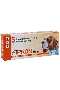 • dodržujte stanovené dávkování a dávkovací režim. Přípravek podávejte v dávkách doporučených výrobcem, aby byl zajištěn optimální terapeutický účinek. 4.5 Zvláštní opatření pro použití Zvláštní opatření pro použití u zvířat Je důležité aplikovat přípravek na takové místo, ze kterého si jej zvíře nemůže slíznout, a po aplikaci zabránit vzájemnému olizování zvířat. Přípravek aplikovat pouze na povrch kůže. Nepodávat perorálně nebo parenterálně. Vyhnout se podání přípravku na sliznice (do očí, nozder, na sliznice genitálií a na poraněnou kůži). V případě výskytu blech je vhodné současné ošetření ostatních zvířat v domácnosti insekticidními přípravky. Koupání/šamponování zvířete se nedoporučuje během 2 dnů po aplikaci, stejně jako koupání častější než jedenkrát týdně. Po aplikaci přípravku zabraňte koupání psa v přírodních vodních zdrojích (viz bod 6.6). Některá klíšťata se mohou po ošetření přichytit, ale jsou usmrcena 24 - 48 hodin po aplikaci. K tomu obvykle dochází před maximálním napitím klíštěte, což minimalizuje, ale nevylučuje riziko přenosu transmisivních onemocnění. Blechy z domácích zvířat často zamořují zvířecí přepravky, místa, kde zvíře spí a odpočívá, jako jsou koberce a domácí vybavení, které je třeba v případě masivního napadení a na začátku ochranných opatření pravidelně ošetřovat vhodnými insekticidy a čistit pomocí vysavače. Zvláštní opatření určené osobám, které podávají veterinární léčivý přípravek zvířatům Lidé se známou přecitlivělostí na fipronil nebo na některou z pomocných látek by se měli vyhnout kontaktu s přípravkem. Zabraňte kontaktu přípravku s prsty. V případě potřísnění si umyjte ruce mýdlem a vodou. Tento přípravek může způsobit podráždění sliznic a očí. Proto zabraňte kontaktu přípravku s ústy a očima. V případě náhodného zasažení očí je důkladně vypláchněte vodou. Pokud podráždění přetrvává, vyhledejte lékařskou pomoc a ukažte příbalovou informaci nebo etiketu praktickému lékaři. Nemanipulujte s ošetřenými zvířaty a zamezte dětem hrát si s nimi, dokud místo aplikace nezaschne. Doporučuje se proto neošetřovat zvířata během dne, ale v podvečer, a nedovolit čerstvě ošetřeným zvířatům spát s jejich majiteli, zejména s dětmi. Během aplikace přípravku nekuřte, nepijte ani nejezte. Po použití si umyjte ruce. Další opatření: Fipronil může mít nežádoucí účinky na vodní organismy. Psům by nemělo být dovoleno plavat ve vodních tocích po dobu 2 dnů po ošetření. Přípravek může mít nepříznivý vliv na natřené, lakované nebo jiné plochy v domácnosti nebo vybavení bytu. 4.6 Nežádoucí účinky (frekvence a závažnost) Po olíznutí přípravku se může objevit krátkodobá hypersalivace způsobená charakterem vehikula. Velmi vzácně byly po použití hlášeny přechodné kožní reakce v místě aplikace (vyblednutí a vypadávání srsti, svědění, zarudnutí kůže) a celkové svědění nebo vypadávání srsti. Výjimečně byla hlášena hypersalivace, reverzibilní neurologické symptomy (hyperesthesie, deprese, nervozita), zvracení nebo dýchací problémy. V místě aplikace se mohou objevit kosmetické vady (slepená srst, bílé depozity). Vyvarujte se předávkování. V případě přetrvávajících nežádoucích účinků vyhledejte pomoc veterinárního lékaře. 4.7 Použití v průběhu březosti a laktace Bezpečnost byla ověřena u chovných a březích fen a u fen v laktaci, kterým byla několikrát podána trojnásobná dávka dávky doporučené. Přípravek může být podán chovným, březím i laktujícím fenám. 4.8 Interakce s dalšími léčivými přípravky a další formy interakce Nejsou známy. 4.9 Podávané množství a způsob podání Pro nedostatek údajů je minimální doba mezi dvěma aplikacemi 4 týdny. Způsob podání: podání nakapáním na kůži – spot-on. Dávkování závisí na hmotnosti zvířete. Psi o hmotnosti 2-10 kg: obsah jedné tuby o objemu 0,67 ml (S) Takto zajistíte minimální doporučenou dávku fipronilu 6,7 mg/kg ž. hm. Měsíční léčba se doporučuje v případě vysokého rizika opakovaného napadení blechami, pokud je pes alergický na bleší kousnutí, v případě nutnosti kontroly napadení klíšťaty nebo při častém koupání psa za použití hypoalergenních nebo zvláčňujících šamponů. V oblastech, kde nehrozí vážné napadení blechami a klíšťaty, může být FIPRON spot-on pro psy aplikován každé dva až tři měsíce. Způsob podání: Tubu držte hrdlem nahoru a několikrát poklepejte na hrdlo prstem. Opatrně odlomte špičku kroutivým pohybem. Rozhrňte srst zvířete v kohoutku před lopatkami tak, aby byla viditelná kůže. Hrot nástavce přiložte na kůži a několikrát stiskněte tubu tak, aby se celý obsah tuby vyprázdnil přímo na kůži. FIPRON spot-on pro psy je účinný proti napadení blechami po dobu přibližně 2 měsíců a proti napadení klíšťaty po dobu až do 1 měsíce, v závislosti na síle zamoření prostředí. Blechy jsou usmrceny během 24 hodin po infestaci. 4.10 Předávkování (symptomy, první pomoc, antidota, pokud je to nutné) Laboratorní studie potvrdily bezpečnost pro cílový druh zvířat. Laboratorní studie byly prováděny na štěňatech (ve stáří 8 týdnů) a na psech o hmotnosti cca 2 kg. Podaná dávka byla pětkrát vyšší než doporučená dávka. Studie neprokázaly žádné nežádoucí účinky. Riziko výskytu nežádoucích účinků (viz bod 4.6) se může v případě předávkování zvýšit, proto by zvířata měla být vždy ošetřena pipetou správné velikosti, zvolenou podle hmotnosti zvířete. 4.11 Ochranné lhůty Není ur