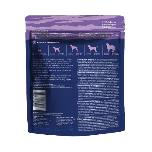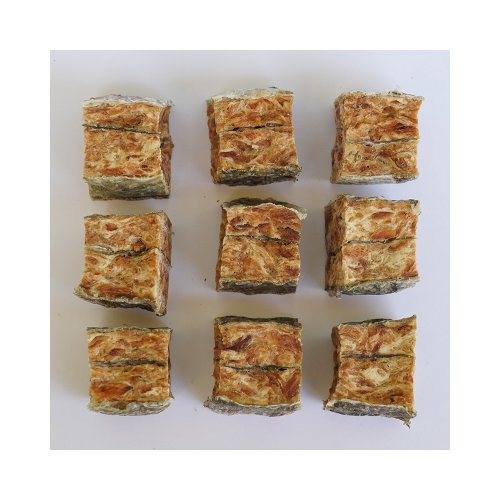 Složení: Losos (85 %), rybí kůže (6 %), rostlinný protein, škrob, glycerin Analytické složky: Hrubý protein 48 %, Hrubá vláknina 0,2 %, Obsah tuku 4,7 %, Hrubý popel 2,8 %