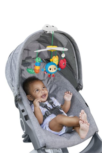 Závěsná hračka kytička s mráčkem zabaví vaše maličké se roztomilými postavičkami. Uprostřed je zvonící objímáček s měkkými ručičkami a nožičkami, měkká housenka má u sebe list, který se dá mačkat, na květince je zrcátko a zavázané uzlíky a měkké chrastící jablíčko s detailem květiny. Závěsná hračka se snadno skládá pro jednoduché uložení.