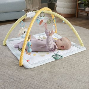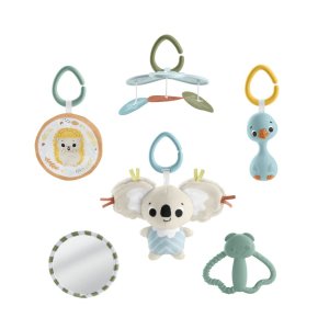 Hrací dečka se senzorickými hračkami od Fisher-Price® je barevná podložka pro miminka, která roste spolu s vaším děťátkem od hraní si vleže až po hru na bříšku. Tato podložka obsahuje oblouk se 6 odnímatelnými smyslovými hračkami, včetně přenosné plyšové koaly s jemným zvoněním a kolotočem, které lze připevnit ke kočárku a užít si tak zábavu i na cestách. Mezi další smyslové hračky patří zrcátko pro sebepoznávání, chrastítko husa, kousátko bez BPA a měkká mačkací hračka, které lze zavěsit na oblouk dečky nebo použít pro hraní na cestách.
