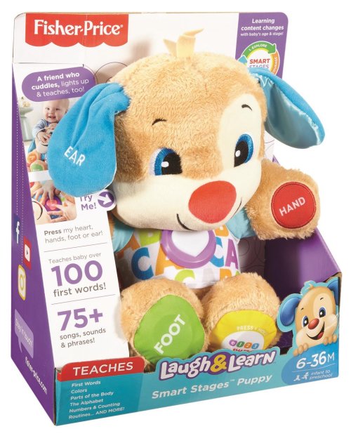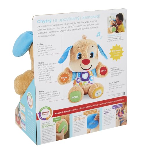 Seznamte se s prvním nejlepším kamarádem vašeho děťátka! Měkoučký Mluvící pejsek z řady Směj se a Poznávej! Smart Stages™ od Fisher-Price® se postará o to, že učení bude vždycky jedna velká legrace. Když se dítě svého čtyřnohého kamaráda dotkne, pejsek hned spustí veselé písničky a fráze, které vašeho drobečka naučí víc než 100 základních slov, části těla, barvy, tvary a mnoho dalšího! Pejskovo srdíčko dokonce barevně bliká do rytmu hudby! Protože se každé dítě vyvíjí jinak rychle, podporuje hračka technologii Smart Stages™, díky níž můžete zvolit takovou úroveň učení, která je pro vaše děťátko zrovna nejvhodnější. Vybrat můžete mezi třemi herními úrovněmi.
