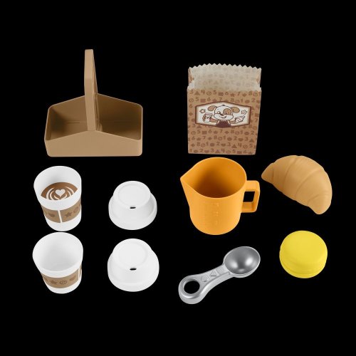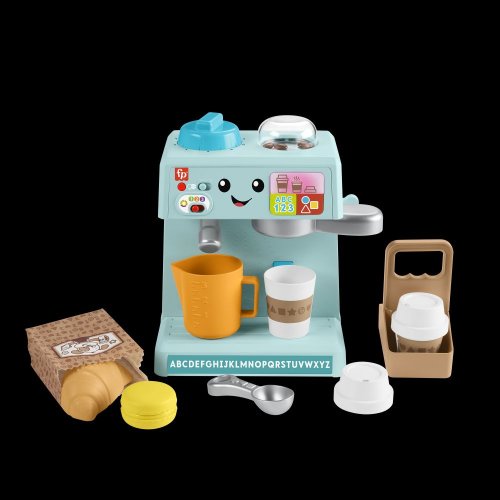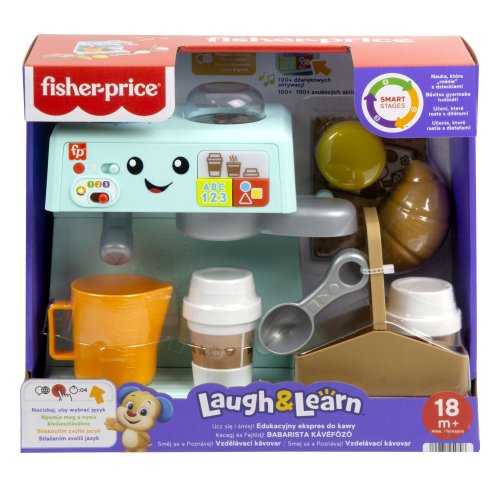 Malí baristé mohou připravovat, podávat a sdílet kávu s tímto zábavným herním setem pro batolata od Fisher-Price®! Stisknutím tří tlačítek, která učí přípravu kávy, otáčením kolečka pro napěnění nebo při plnění šálku děti aktivují více než 75 písniček, zvuků a frází! Zábavné je, když děťátko pohybuje mlýnkem na kávu tam a zpět, a vyskakují tak kávová zrna! Součástí je 9 herních doplňků: 2 kelímky na kávu s víčky, lžička na míchání, croissant, taška na měkké zboží s sebou, kelímek na mléko a nosící podložka na dva šálky, kterou využijí děti na cestách! A to vše s funkcí Smart Stages™, která dětem pomáhá učit se abecedu, barvy, počítání a mnoho dalšího!