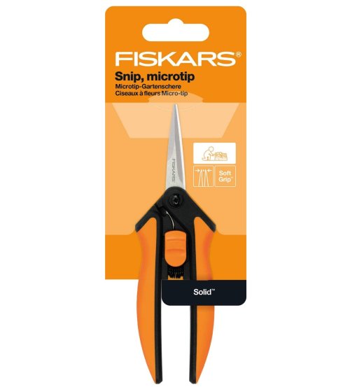 Prostříhavací špičaté zahradní nůžky Fiskars Solid SP130 jsou ideální pro podporu zdravého růstu rostlin a květin Přesné čepele jsou výborné pro tvarování, opakované prostříhávání a přesný střih v těsných místech Čepele z nerezové oceli, přesný výbrus Držadla s povrchem Softouch