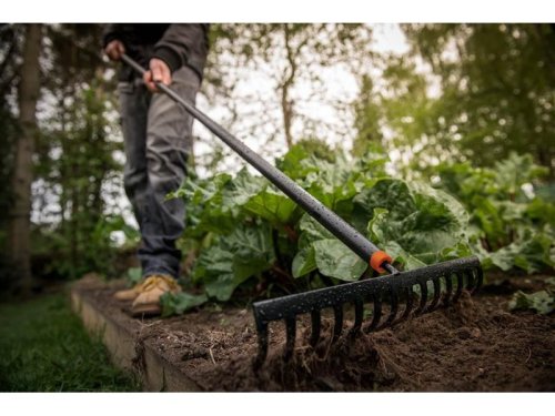 Víceúčelové hrábě pro přípravu půdy před setbou, urovnávání záhonů a další práce na zahradě jako je shrabování větví nebo mulčování. Čepel z kalené karbonové oceli. Násada je z hliníku.