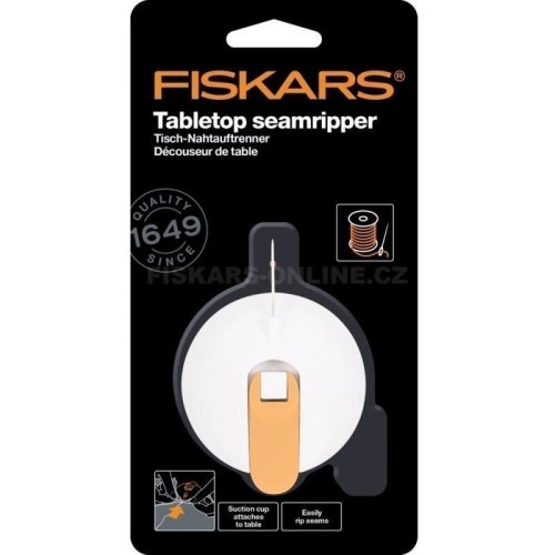Stolní párač švů Fiskars s přísavkou pro snadné párání švů br Manipulujte s látkou oběma rukama br Kryt párače lze uložit pod upínací páku