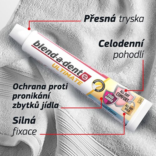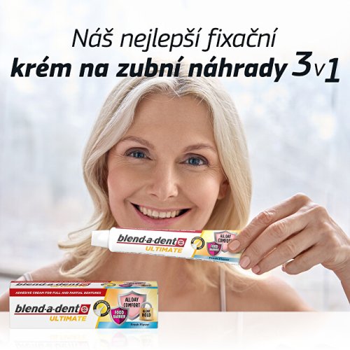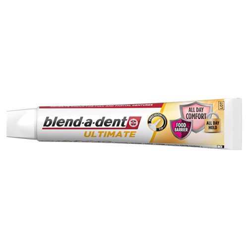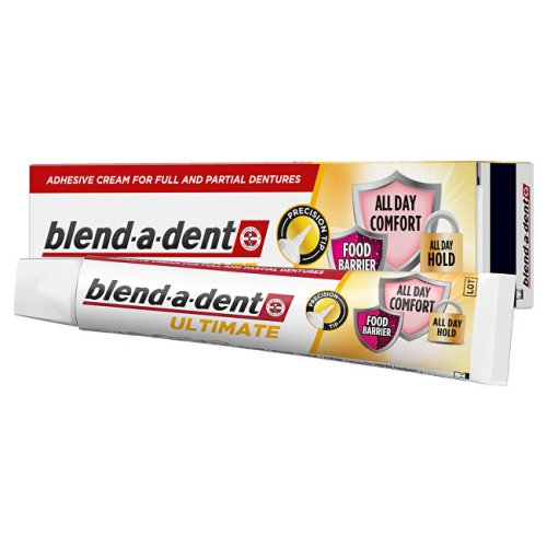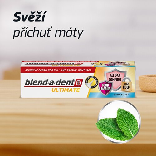 Nejlepší technologie Blend-a-dent: pomáhá zabránit pronikání částic jídla pod zubní náhradu a nabízí silnou fixaci po celý den pro celodenní komfort. S čerstvou mátovou příchutí. Jeho přesná tenká tryska umožňuje přesnou aplikaci a pomáhá vytvořit pohodlnou bariéru proti vniknutí potravin. Tento ultimátní fixační krém je přizpůsobený pro úplné i částečné zubní náhrady.