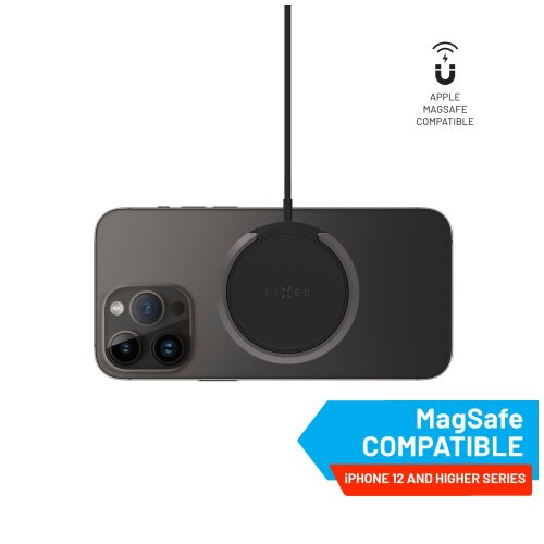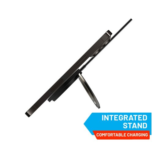 Vylepšená verze oblíbené bezdrátové nabíječky v novém designu s kovovým vyklápěcím stojánkem je navržena přímo pro iPhone 12 a vyšší s podporou funkce MagSafe. Integrované magnety bezpečně uchytí nabíječku k tělu telefonu a usnadní manipulaci při nabíjení. Díky technologii Qi lze nabíjet i smartphony jiných značek s výkonem až 15W (7,5W pro iPhone). Nabíjení se spustí okamžitě po přiložení nabíječky k zádům telefonu, před poškrábáním je chrání jemný silikonový povrch nabíječky. Připojený kabel o délce 1,2 m je ukončený USB-C konektorem pro připojení do nabíjecího adaptéru. Díky stojánku z odolné broušené slitiny si můžete během nabíjení telefon postavit do horizontální nebo vertikální polohy. Tenké tělo nabíječky dokonale splyne se zády telefonu.