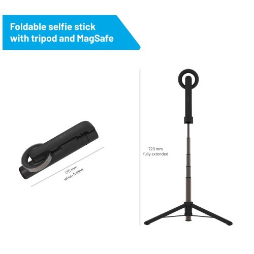 Nastavitelná délka až 72 cm Lze použít jako stativ Odnímatelná spoušť s dosahem až 10 m Podporované telefony iPhone 12 a novější Uchycení pomocí MagSafe Kompatibilní s MagSafe kryty