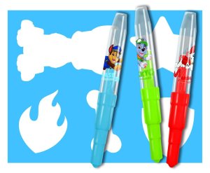 Balení obsahuje 10 barevných foukacích fixů s potiskem v oblíbených motivech a 1 šablonku.
