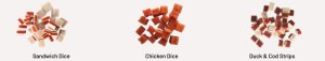 Sendvičové kostky: kuřecí 42,2 %, ryba 18 %, treska 14,5 %, glycerin 10,1 %, škrob 6,7 %, arašídový protein 2,3 %, hrachový protein 2,3 %, sorbitol 3,7 %, sůl 0,2 %. Analytické složky: vlhkost 23 %, hrubý protein 20 %, hrubý popel 8 %, hrubá vláknina 3 %, hrubé tuky 1 %, chlorid sodný 0,2 %.