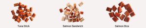 Lososové kostky: ryba 43,7 %, kuřecí 20 %, škrob 18 %, sójový protein 2 %, arašídový protein 1 %, hrachový protein 1 %, glycerin 12 %, sorbitol 2 %, sůl 0,3 %. Analytické složky: hrubý protein 23 %, vlhkost 23 %, hrubý popel 8 %, hrubá vláknina 3 %, hrubé tuky 0,5 %, chlorid sodný 0,3 %.