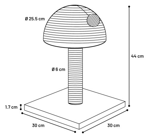 Škrabadlo Asha je perfektní místo, kde si Vaše kočka může hrát a relaxovat škrábáním. Je robustní a stabilní, se základovou deskou o tloušťce 1,7 cm a sloupkem o průměru 6 cm. Potaženo měkkým plyšem s gramáží (300 g/m²) a jutovým lanem o tloušťce 4 mm. S chrastící hračkou pro extra zábavu.