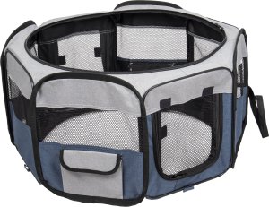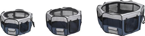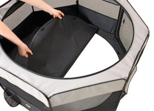 Cestovní ohrádka pro psy je praktická a lehká. Jednoduše se složí do velikosti tašky, a proto si ji můžete vzít všude s sebou. V přední a zadní části je vstupní otvor na zip. Vrchní síťka je odnímatelná. Praktická kapsa na boční straně Vám umožní uschovat potřebné věci.
